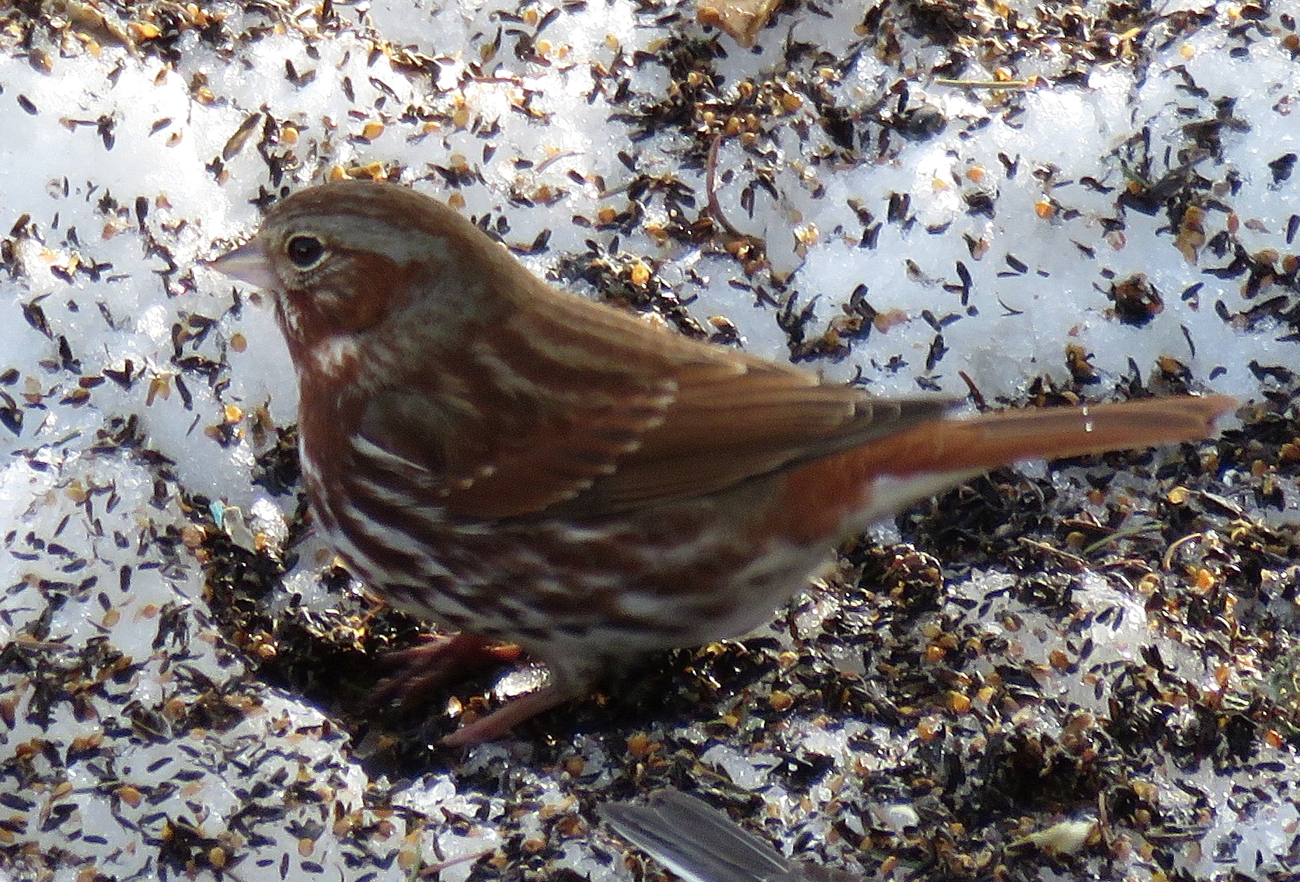 For the past several days, a dozen fox sparrows migrating to their breeding grounds have joined the common redpolls, dark-eyed juncos, black-capped chickadees, song sparrows, blue jays, mourning doves, and common grackles at my bird feeding site. Larger than song sparrows, the fox sparrows have a striking rusty-red plumage streaked with grey. The males’ song is a bright, bubbling melody.